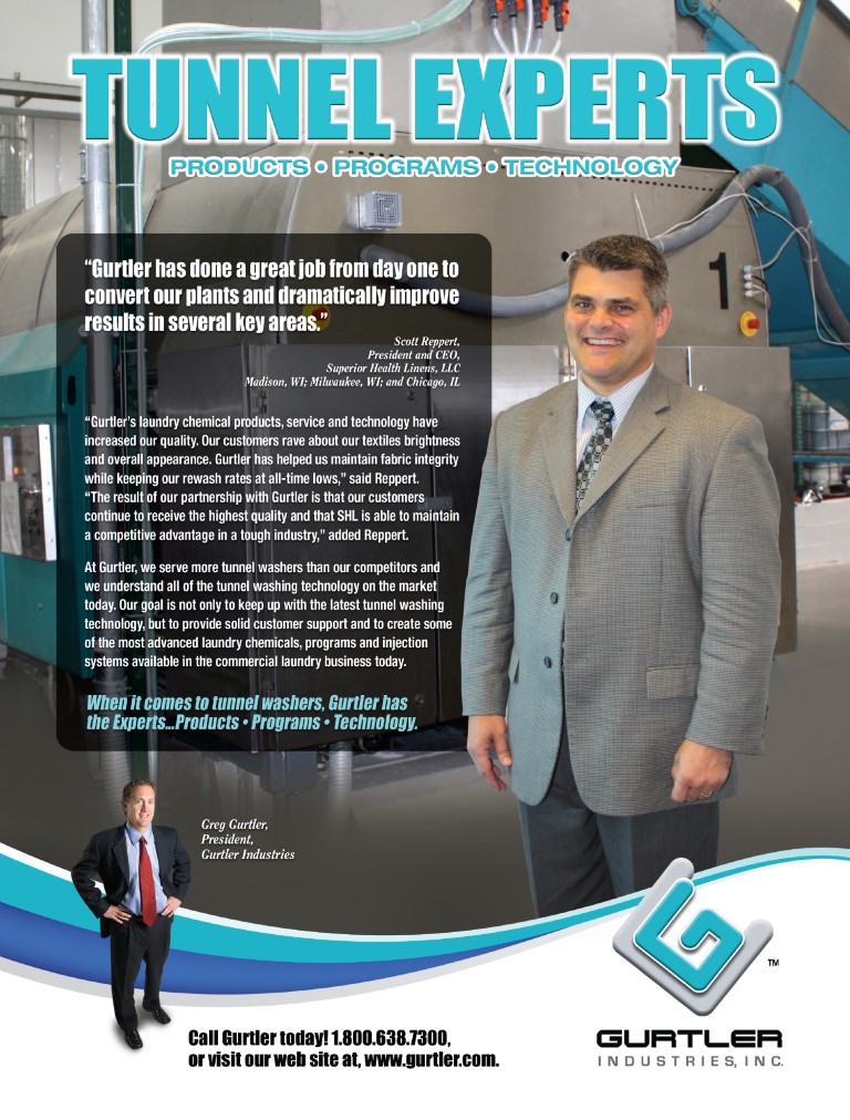 “Gurtler Industries has a broad base of expertise in tunnel washing systems and how to make them perform at peak efficiency,” says Rick Kislia, Chief Operating Officer, Crescent Laundry. “From the top on down the Gurtler team is tuned into our industry and our needs. Our quality has improved significantly ...